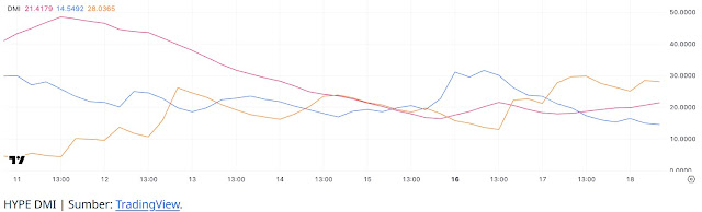 Sinyal teknikal untuk Hyperliquid (HYPE) makin menguat ke arah bearish. Dalam dua hari terakhir, indikator +DI anjlok tajam dari 31,61 ke 14,54, sementara -DI justru melonjak dari 12,97 ke 28. Persilangan dua garis ini disertai jarak yang makin melebar, menandakan bahwa tekanan jual kini jauh lebih dominan daripada dorongan beli.
